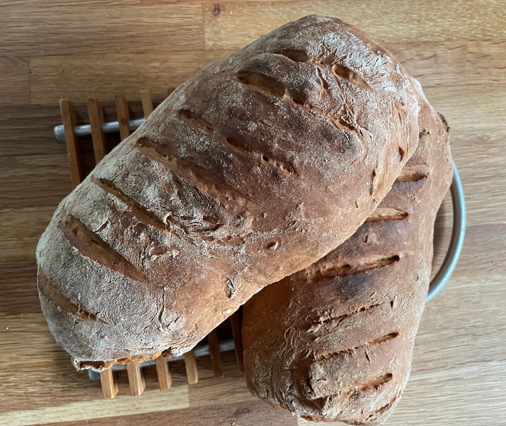 Då det är torsdag idag serverar jag potatissoppa med örtolja enligt receptet i gårdagens inlägg. Dagens bakade bröd passar perfekt till. Jag blev tipsad om det av min yngsta son och har sedan gjort en del små ändringar för att passa vårt hushåll. Brödet behöver bara jäsa en gång och plåten sätts in i en kall ugn vilket gör att det jäser en andra gång under uppvärmningstiden. Smart!
