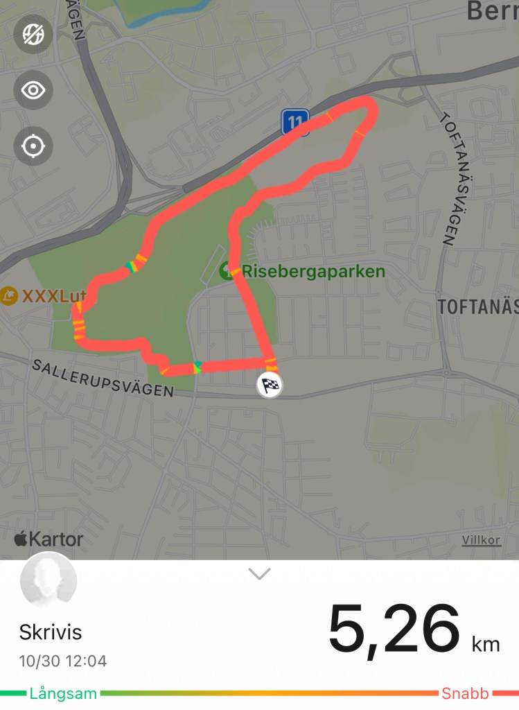 Nu är det söndag och då rekord är till för att sättas eller bibehållas blev det en runda igen. Dock gjorde vi gårdagens fast motsols. Så här blev resultatet: 5,26 km och 6847 steg. Bilden ovan är beviset. De två gröna fälten är dels en där vi skulle passera en gata och släppa fram bilar, det andra när jag tog ett fotostopp.