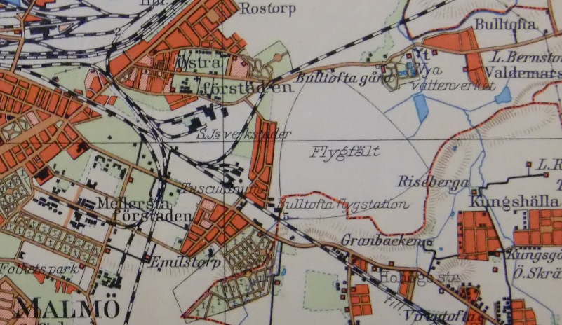 Kartan är från boken ”Svenska Orter, södra Götaland” som gavs ut 1932 och visar samma område som den nya kartbilden högre upp. Flygfältet har funnits sedan 1923. Innan Brommas flygfält i Stockholm stod färdigt 1936 var Bulltofta Sveriges och ett av Europas modernaste och största flygfält. Den Skånska flygflottiljen F 10 hade sin bas på Bulltofta. 1 december 1972 lades all flygverksamhet på Bulltofta ner och en stor del av verksamheten flyttade till det då nybyggda Sturup.