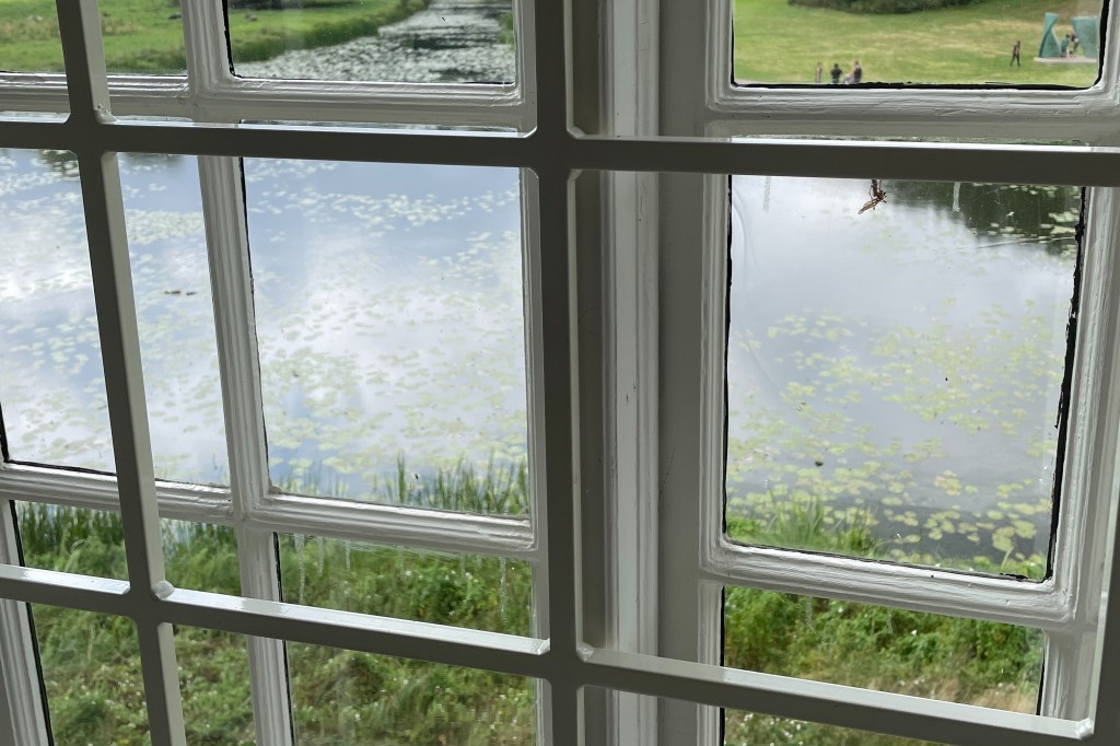 I biblioteket andas det 1800tal och det var 1812 som slottet köptes av hovmarskalken Gustaf Julius Coyet 1775-1862. Han var en modern man vilken anlade både en dansbana på ägorna, grävde ut kanaler och började anlägga den trädgård som fortfarande finns. När han levde fanns inte biblioteket vi nu besökte, det var på hans tid ett stall. Biblioteket kom till i början av 1900talet. Familjen Coyet ägde Torups slott under flera generationer och kvinnan vid tavlan är ytterligare en av dem, Henriette Coyet som gjorde Torup till en mötesplats för många personer inom vetenskap, konst och kultur. Hon köpte böcker inom många områden. De båda medlemmarna i släkten Coyet satte sig ner för att dricka kaffe tillsammans och sådant är ju fullt möjligt när fantasi och verklighet möts på Torup.