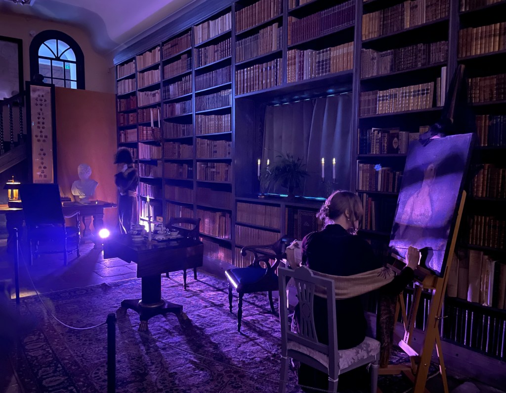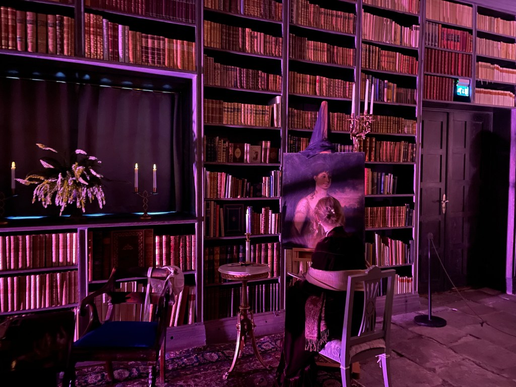 Det var dags för förflyttning i Torups rum och återigen dök det upp en ledsagare och vi fick via en trappa gå ner till ett mörklagt bibliotek. Efter en stund gick det att se två personer.