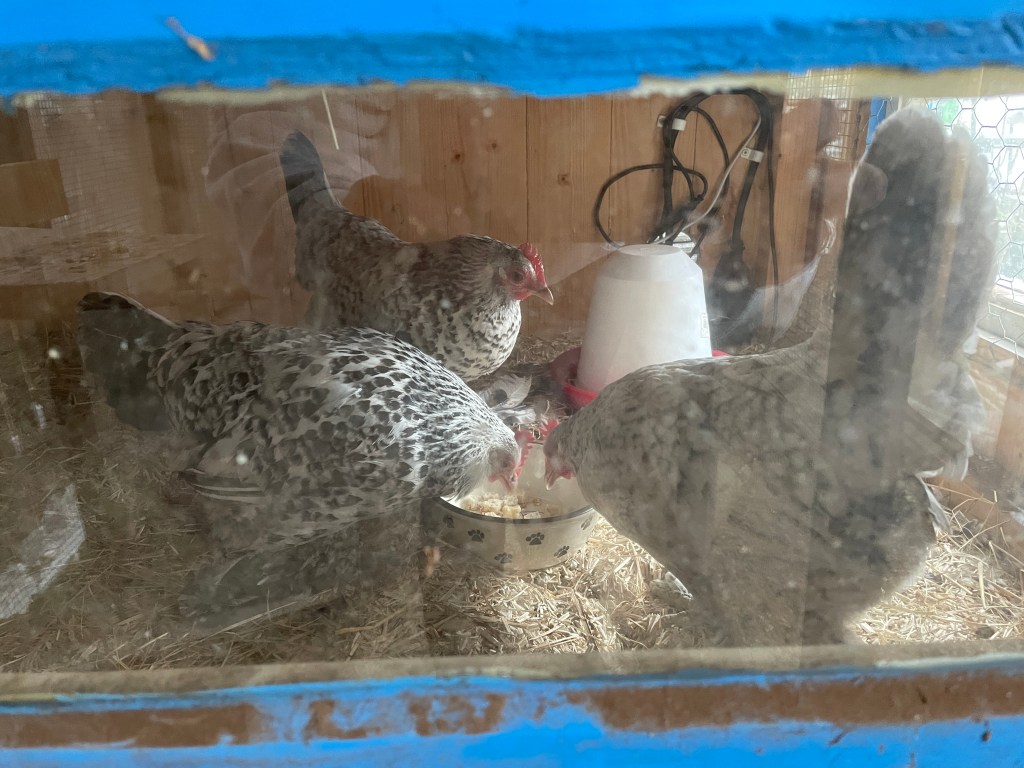Hönorna har börjat tillbringa mer tid inne i sitt hus men de sover som alltid utomhus. Som vanligt blir de så glada och kommer springande för att möta oss när vi kommer in på deras lilla inhägnade gård. Knasiga men mysiga damer det där!