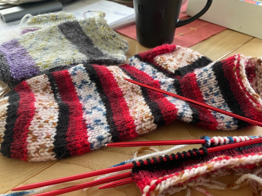 Årets julklapp har korats och tros bli hemstickade plagg vilket glädjer alla oss stickande fantaster. Sockor, handledsvärmare och annat produceras hos mig på löpande band och ibland känns här som rena tomteverkstaden.