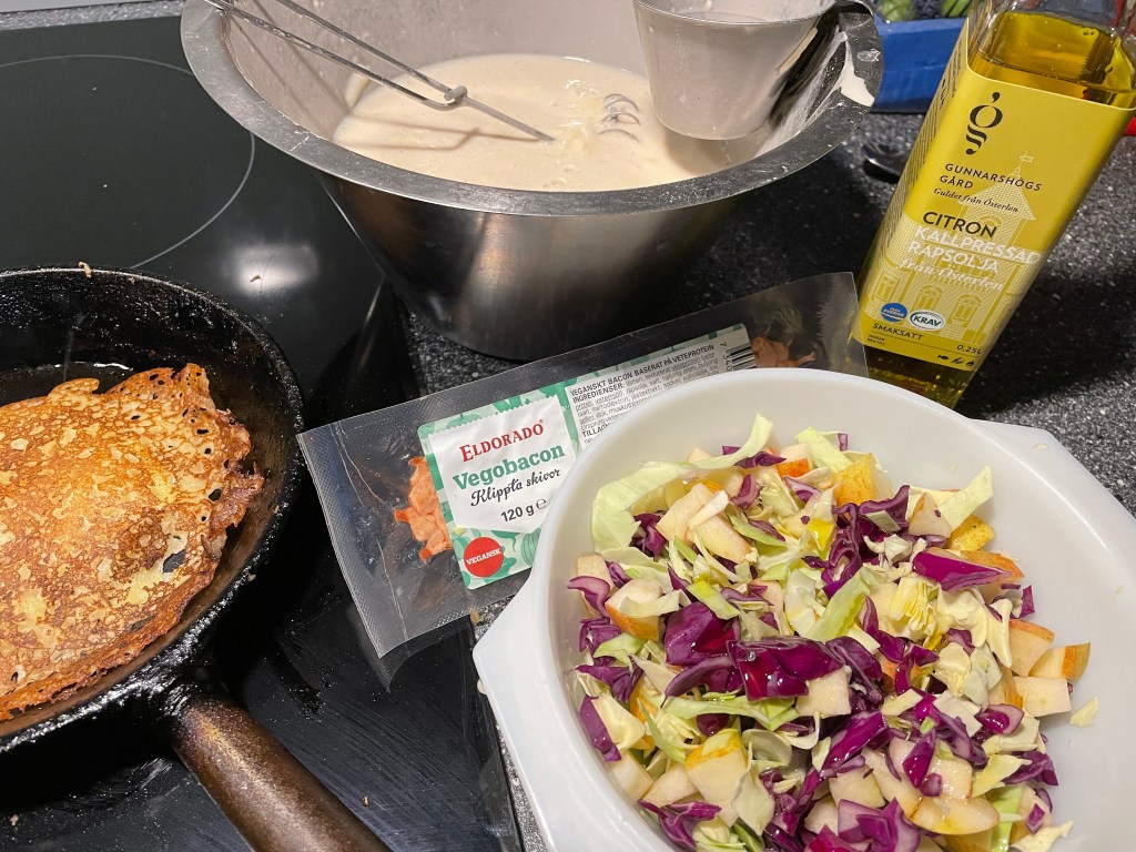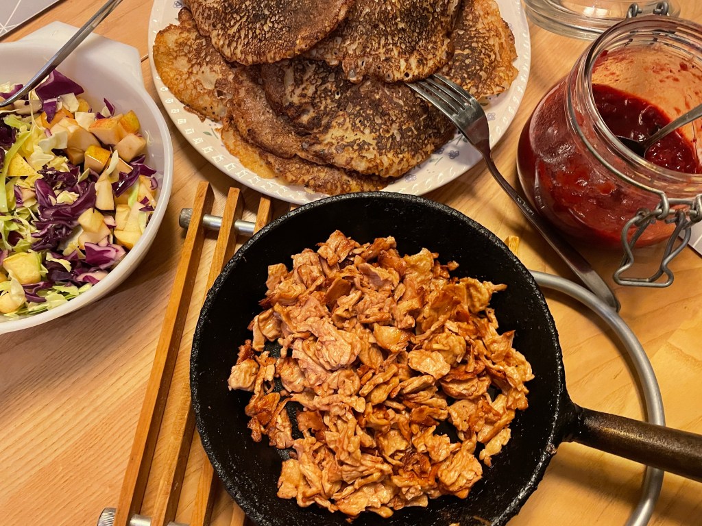 Vår svenska husmanskost passar bra för att värma frusna kroppar. Igår stekte jag raggmunkar som serverades med vegobacon, en råkostsallad och hemkokt lingonsylt. Riktig höst/vintermat.
