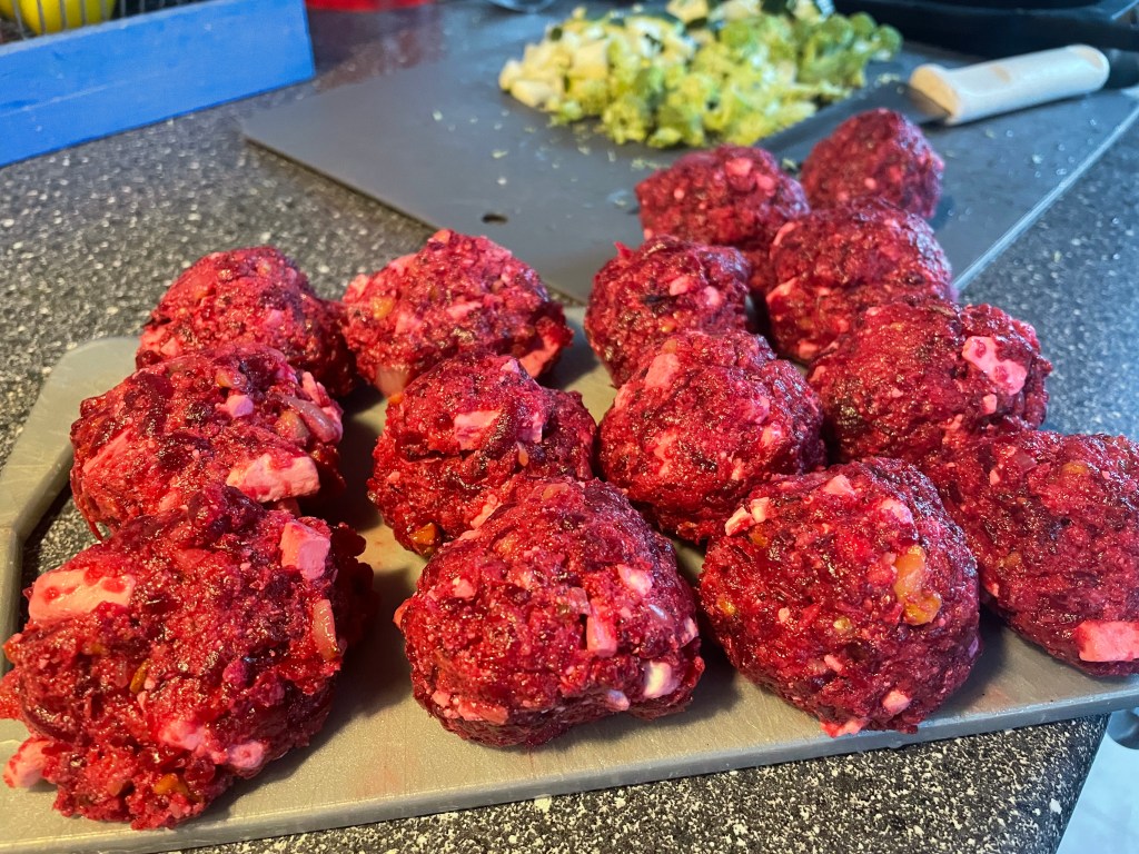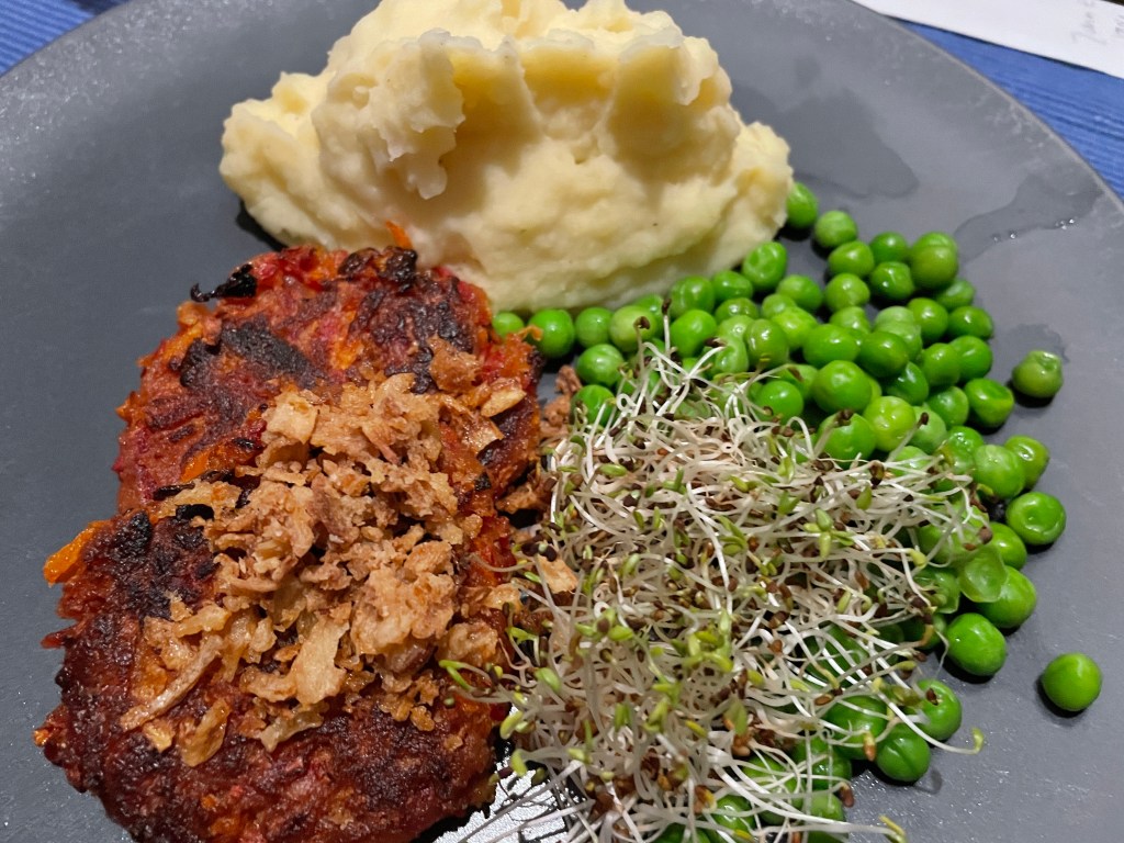Dagens måndagsrätt ska nu tillagas och det blir hemlagade rödbetsbiffar med potatismos, rostad lök och gröna ärtor. Biffarna passar även bra att göra burgare av.