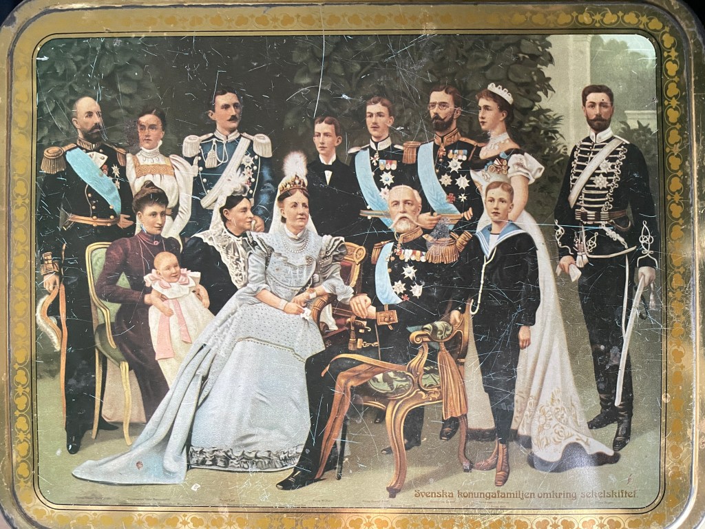 I vårt kök finns en stor plåtburk som används till knäckebröd. Lockets bild föreställer den svenska kungafamiljen vid sekelskiftet 1900. Bilden massproducerades och fanns som en tavla i många svenska hem vid den tiden. I centrum sitter Kung Oskar II med sin gemål Sofia av Nassau, 1836-1913. Paret hade gift sig i den tyska staden Wiesbaden den 6 juni 1857. En av deras söner var Gustav (V) vår nuvarande kungs farfars far.