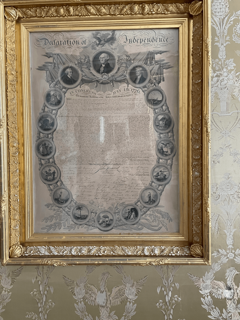 Rosersbergs Slott utanför Sigtuna är ett Kungligt Slott med anor från släkten Oxenstiernas tid i början av 1600talet. 1762 köptes det av svenska staten. Merparten av inredningen är från 1700- och 1800talet och slottet användes som ett sommarslott av bl.a. Gustav III:s bror Karl som senare blev Karl XIII. I ett av rummen som kallas för Karl XIII:s konseljsal, finns en tavla inramad i en vacker guldram. Det är ett mycket tidigt exemplar av den amerikanska självständighetsförklaringen som undertecknades 4 juli 1776.