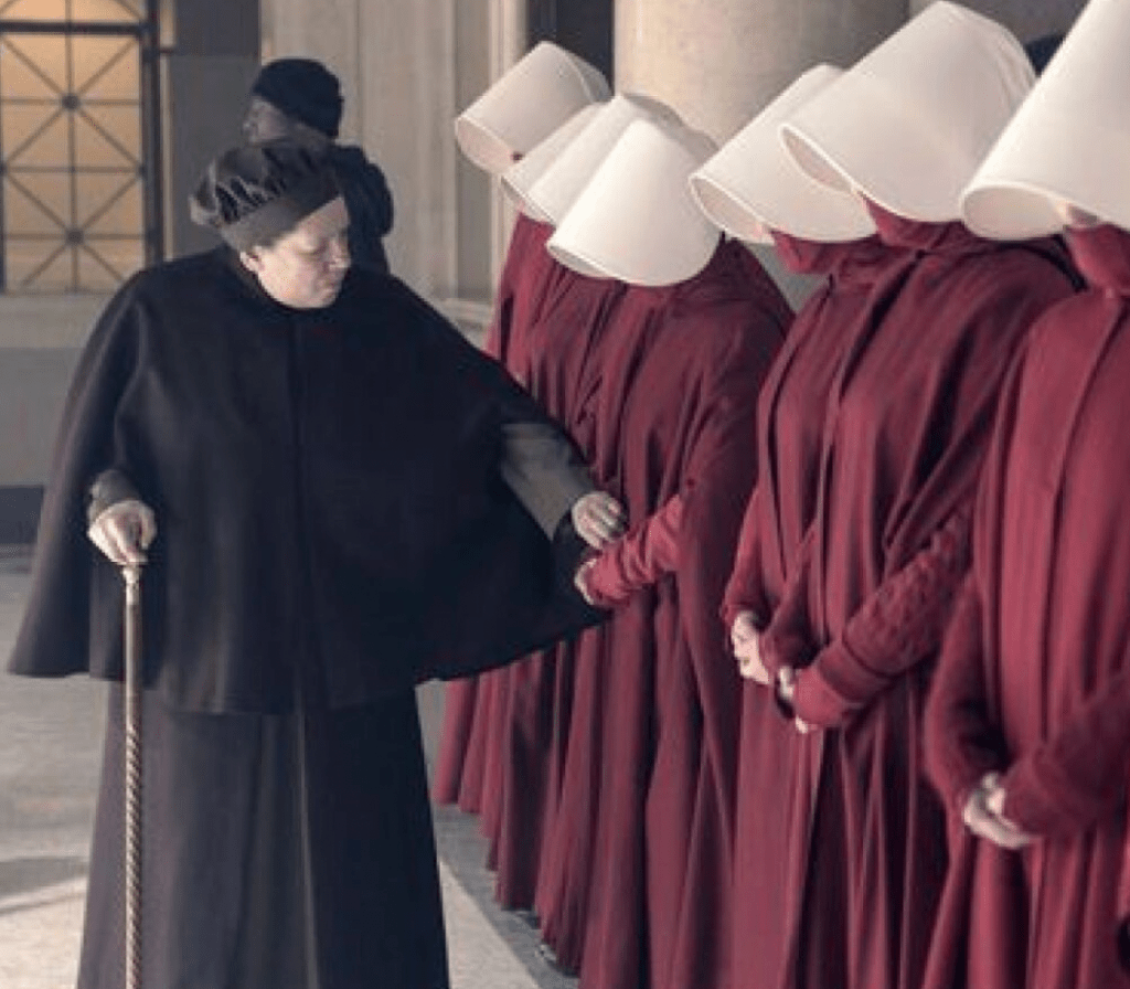 Så till den brunklädda Tant Lydia, en äldre dam som lär upp, kontrollerar, omskolar och styr över tjänarinnorna innan de hamnar i anförarnas hushåll. Där ska de lyda minsta vink och inte ha någon egen frihet. Det händer att någon sätter sig upp mot systemet och då får Lydia ”tala” dem tillrätta.