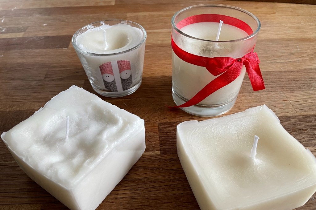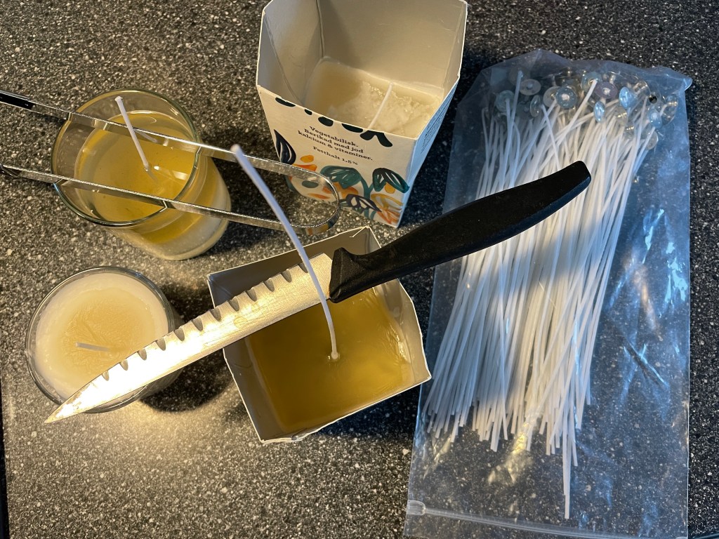 Jag har gjort några egna julljus av ljusstumpar som sparats under hösten. Ljusvekar har köpts och levererades hem till brevlådan. I ett vattenbad placerade jag en rostfri skål där stumparna fick smälta och rensas från gamla vekar. Jag plockade upp skräpet med hjälp av en träpinne. Det varma och flytande stearinet hällde jag sedan i avklippta förpackningar och i tomma ljusglas. När massan stått en liten stund satte jag vekarna på plats och i vissa fall behövde de stöttas för att hamna på mitten. sedan var det bara att vänta på att massan skulle stelna. Det här är ett både kul och bra återbruk.