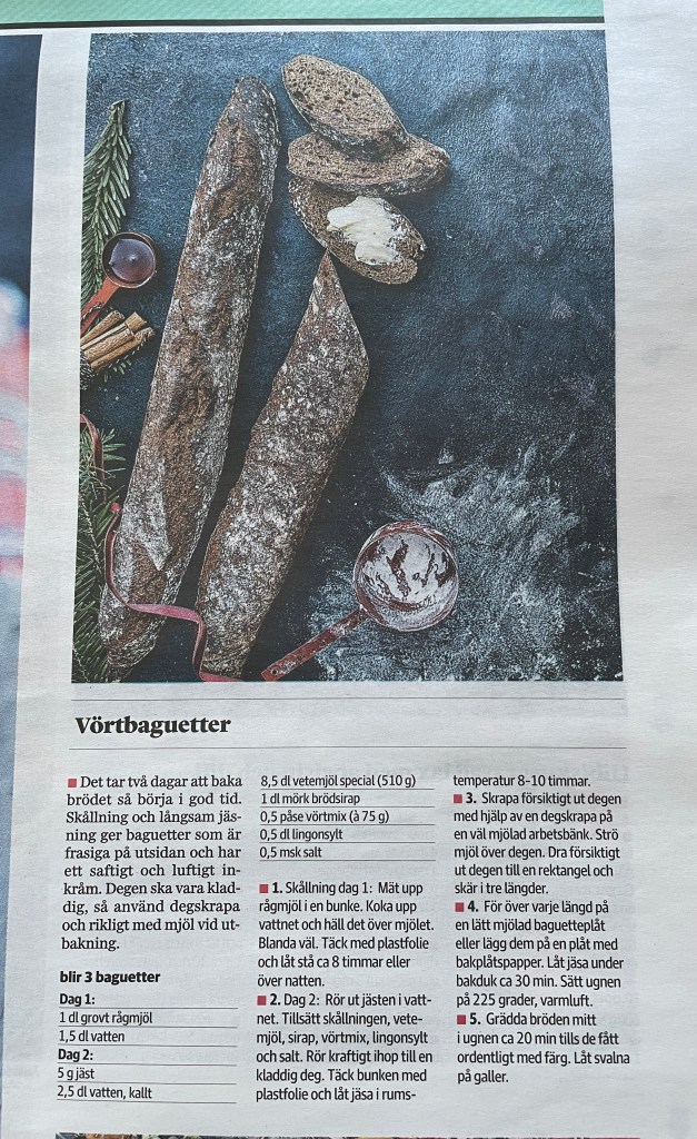 Tidningen Sydsvenskan hade för någon vecka sedan flera julrecept och det här vörtbrödet tilltalade mig så jag sparade receptet. Observera att det är långa väntetider och en liten mängd jäst (5 g) som används. För att snabba på bakningen gjorde jag skållningen av mjöl en kväll och morgonen därpå själva degen. Jag tog 50 g jäst istället och jäste degen 45 minuter. Efter utbakningen ställde jag in plåten i en kall ugn och satte på den vilket gjorde att brödet jäste samtidigt som värmen ökade. Jag plussade på ugnstiden med 20 extra minuter förutom den tid som står i receptet. Alltså 20 + 30 minuter.