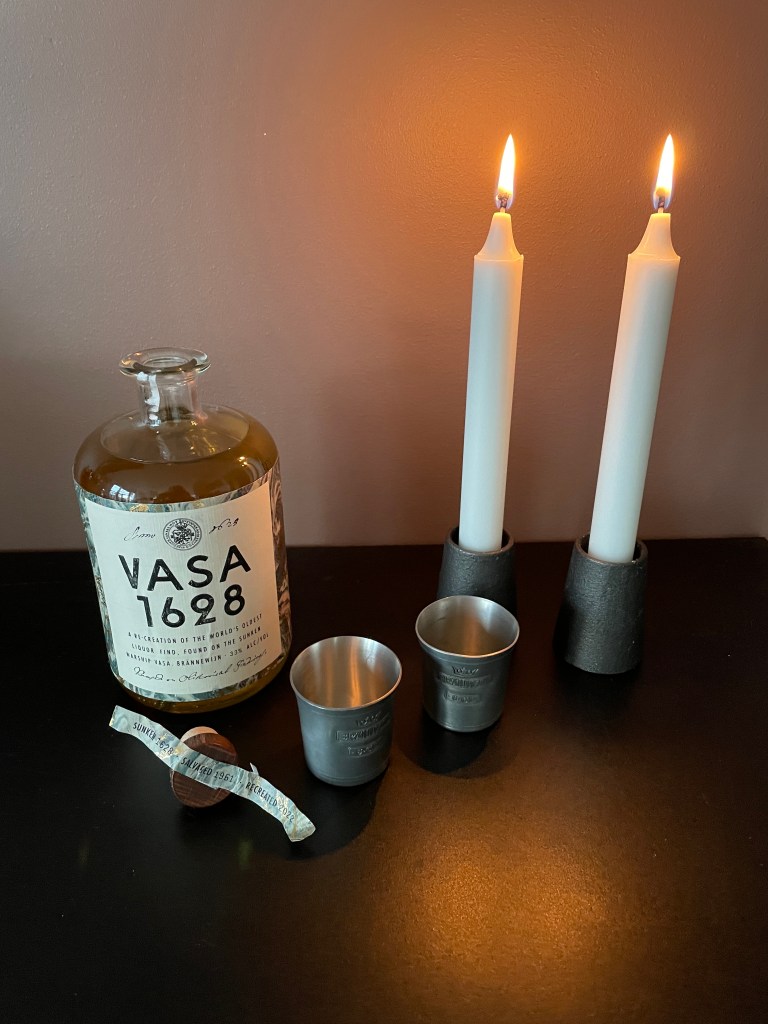 1961 bärgades skeppet Vasa ur havets djup och då räddades några tennflaskor varav en var helt intakt och innehöll sprit (världens äldst bevarade sprit). Innehållet har analyserats och återskapats och idag smakade jag på drycken som fått namnet Vasa 1628. Den dracks naturligtvis ur en tennmugg och smakade mycket bra.