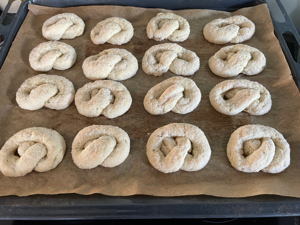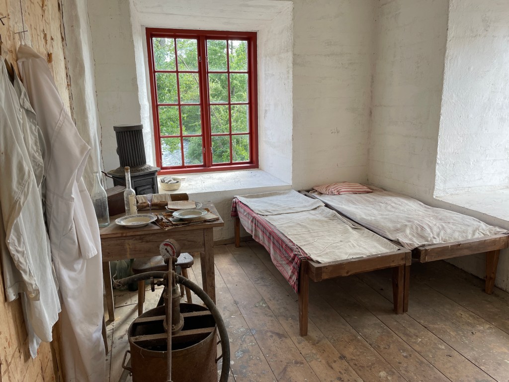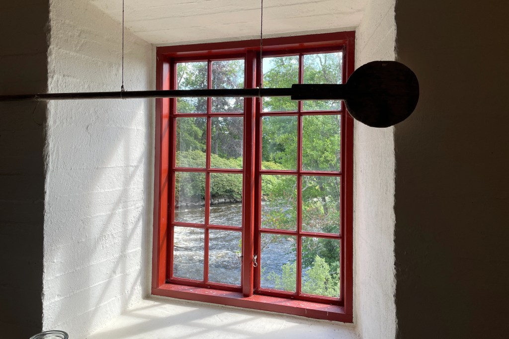 Vid besöket på Huseby var T. och jag inne i den gamla kvarnen vars fönster finns högst upp här på sidan. Om jag blundade kunde jag höra hur kvarnhjulet arbetade och någon skrek ”tocka pau dej” och knuffade till mig med en mjölsäck. Jag tog snabbt min tillflykt in i köksvrån och sovkammaren. Där hittade jag ett recept på kringlor som jag sedan bakade hemma. Min mamma brukade baka sådana men hade inte pärlsocker utan strösocker på bakverken. Jag gjorde mina kringlor med havreyoghurt och vegetabiliskt fett. De blev lika goda som alltid.