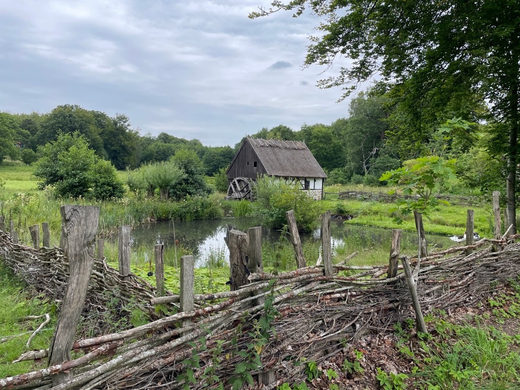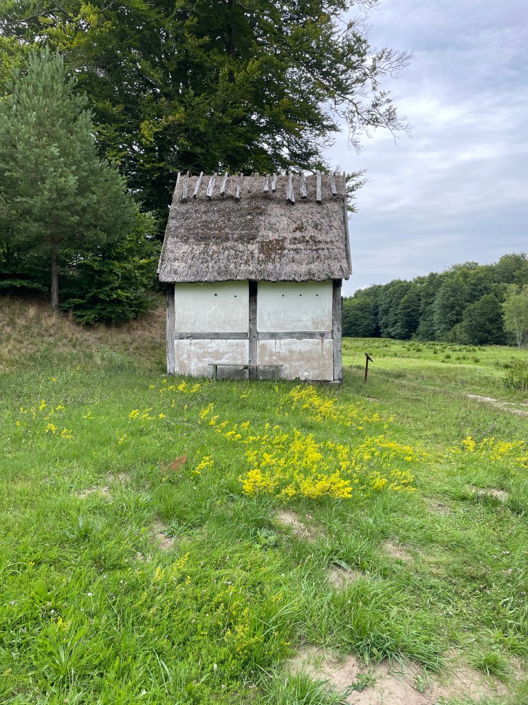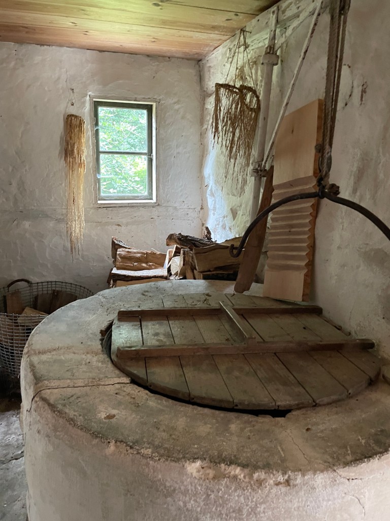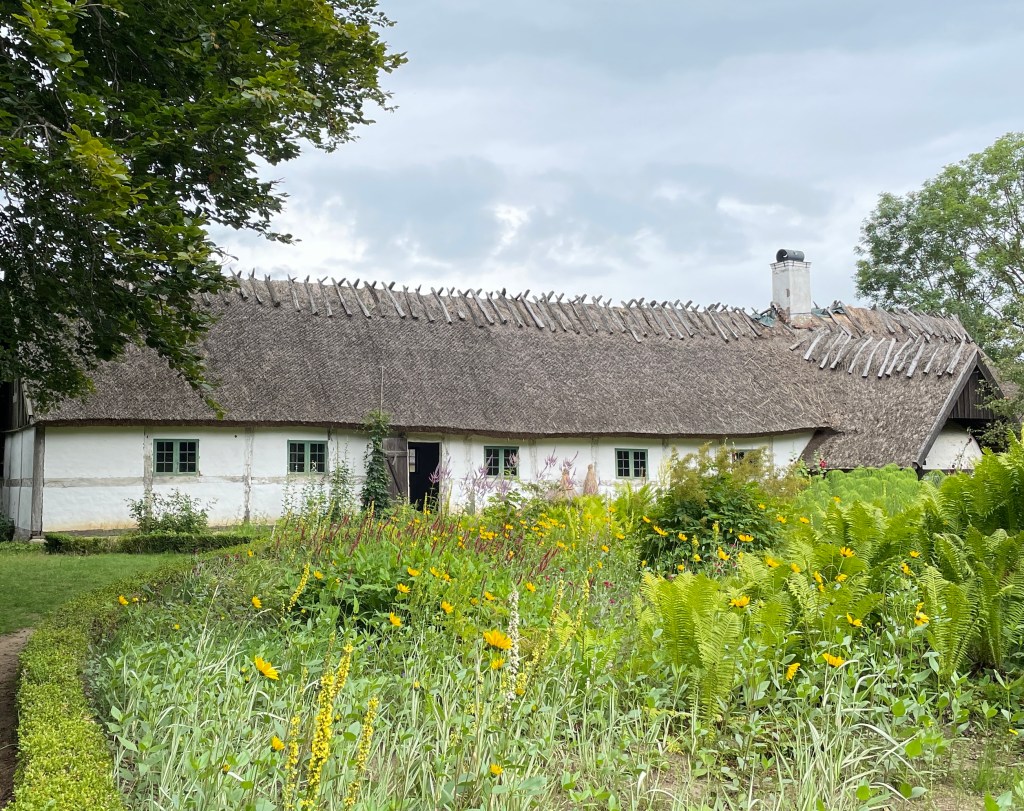 Längst bort i en av längorna kom vi till det stora köket. Där syntes spår av osttillverkning, bakning och minsann om det inte puttrade i grytan på spishällen. Dörren ut mot gården var öppen och där syntes en grön dörr till matkällaren skymta. Vi tittade på den stora bakugnen dit man kom från flera gårdar för att baka en gång i månaden. Bikupor fanns intill en husvägg och ett skåp för ostförvaring hängde på väggen utanför köksdörren. Den här gården var helt självförsörjande enligt den tidens krav.