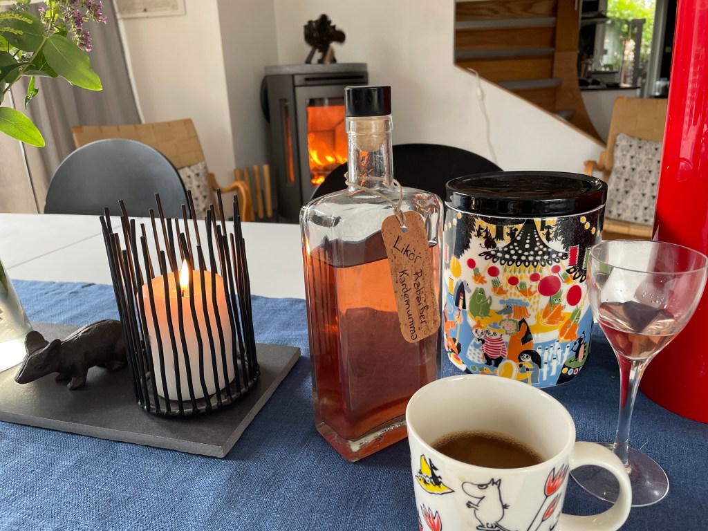 Födelsedagskvällen avslutades hemma vid en tänd brasa med en kaka till kaffet och ett glas hemgjord likör. Kaffet serverades i Muminmuggar såklart. I den fina porslinsburken fanns hembakta lavendeldrömmar som jag lämnar ett recept på längre ner.