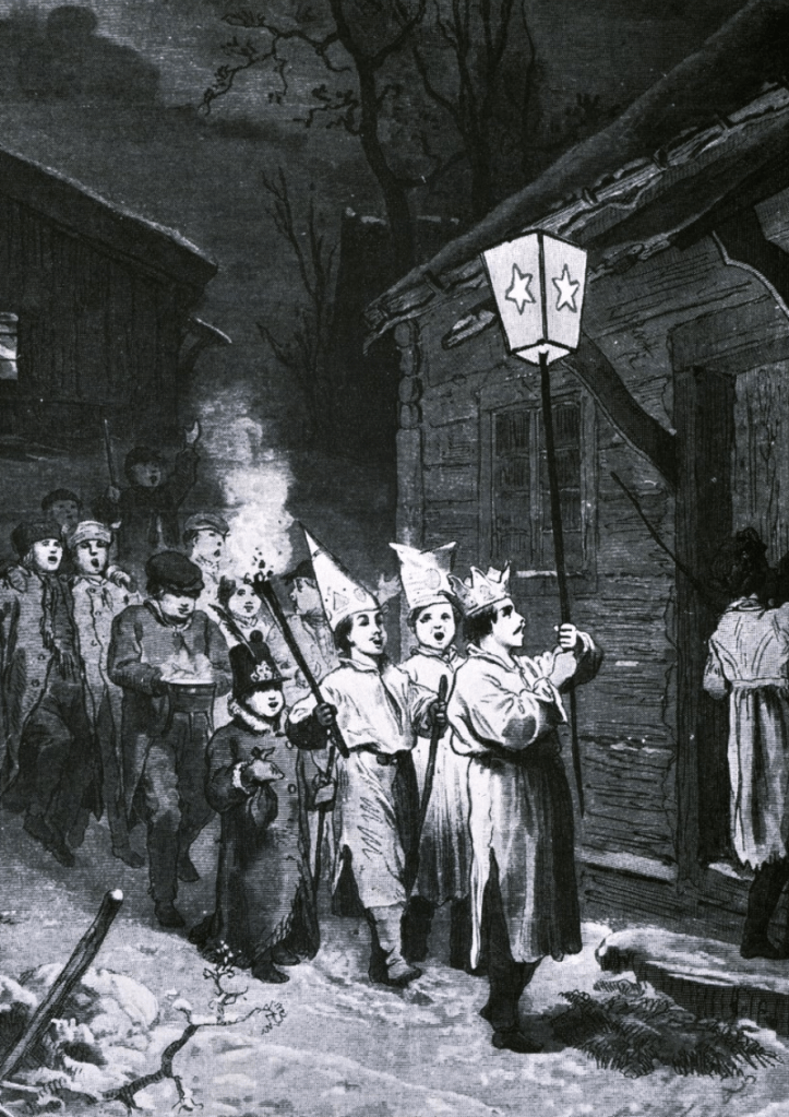 ”Stjärngossetåg har mycket gamla rötter. Det startade redan under medeltiden av präststudenter som inspirerats av katolska kyrkospel. I det svenska bondesamhället vandrade gossar runt i byarna och uppförde skådespel som de vise männen, med sockertoppsformade strutar och vita skjortor – ursprunget till dagens stjärngossar”.