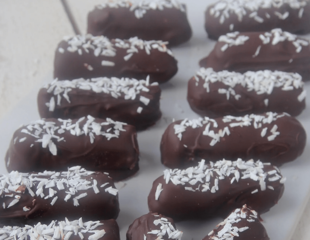 Smält 175g blockchoklad och doppa bitarna i chokladen.