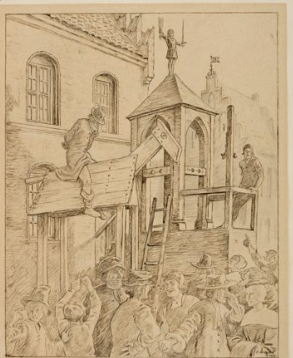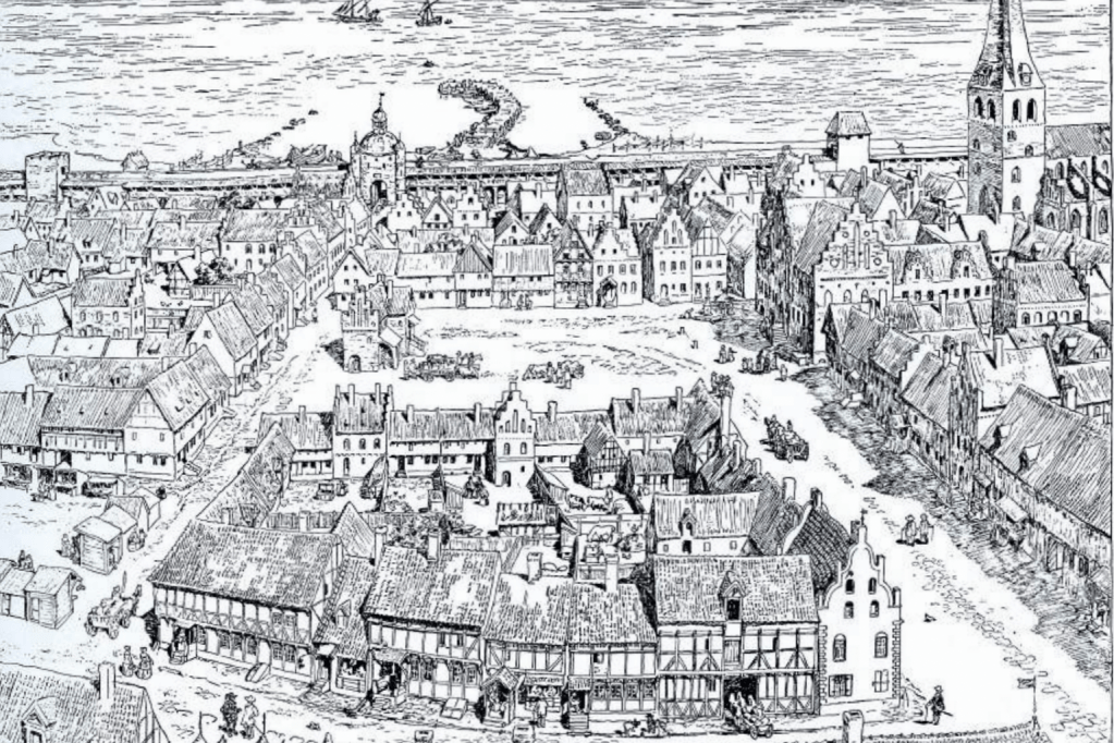 Bilden överst på sidan visar hur historikern och konstnären Einar Bager (1887 – 1990) i Malmö föreställde sig att staden kunde sett ut på 1600-talet. Under samma århundrade fanns det en trähäst utanför rådhuset där personer som inte skött sig kunde hamna som ett straff. Intill hästen fanns en byggnad som kallades för Kåken där olika straffredskap förvarades.