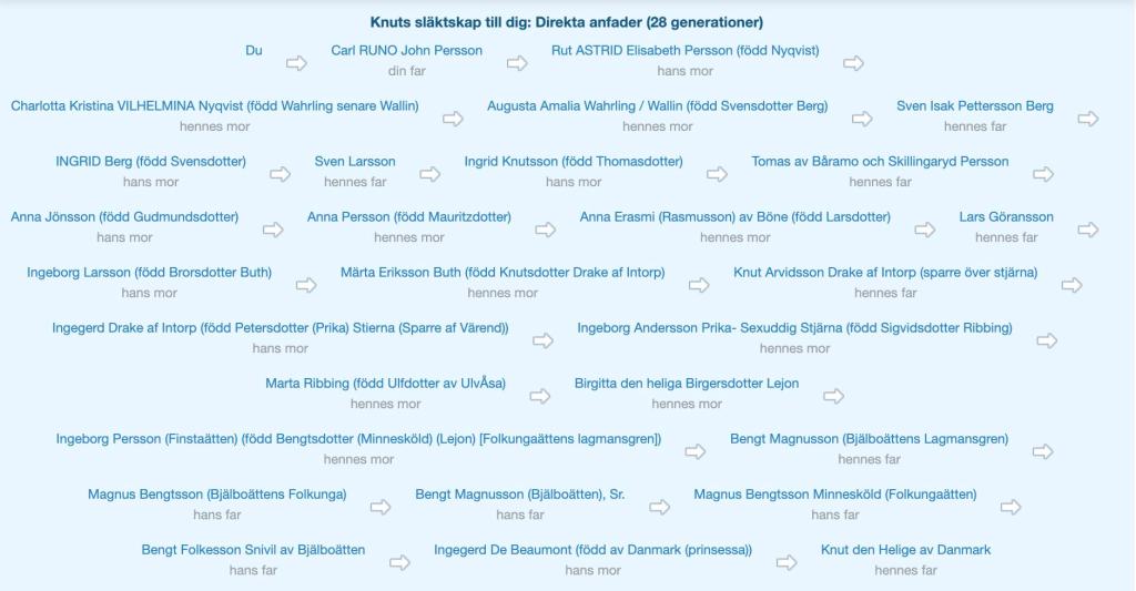 Redan i November förra året besökte vi Rådhuset på en visning men det skadade inte att komma dit igen. Dessutom fick jag återigen hälsa på en historisk släkting, kung Knut den Helige av Danmark (ca. 1042 – 1086). Han finns som en direkt anfader till mig 28 generationer bort. Knut hade den stora oturen att bli mördad i Odense och han blev helgonförklarad inom den Romersk – katolska kyrkan år 1101. Tavlan nedan som visar Knut den Helige hänger i Malmö Rådhus Landstingssal. Den högra bilden är från min släktforskning och visar kopplingen från mig ner till Knut. (klicka på bilden för att förstora)