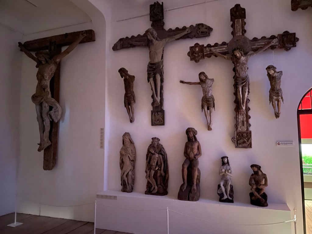 En av våningarna innehåller kyrklig konst och den ska vara mycket lik Utställnigen af äldre kyrklig konst, som visades i Malmö under sommaren 1914, samtidigt med den Baltiska utställningen. Under 1800-talet revs mer än en tredjedel av Skånes medeltida kyrkor. En del av den konst som exempelvis krucifix förstördes, andra hamnade i olika förråd. Otto Rydbeck lät göra en inventering över sådant som fanns kvar och det är vad som nu visas på museet. Nedan syns en del som jag tog en bild på. Till höger är en ingång till ett myntkabinett.