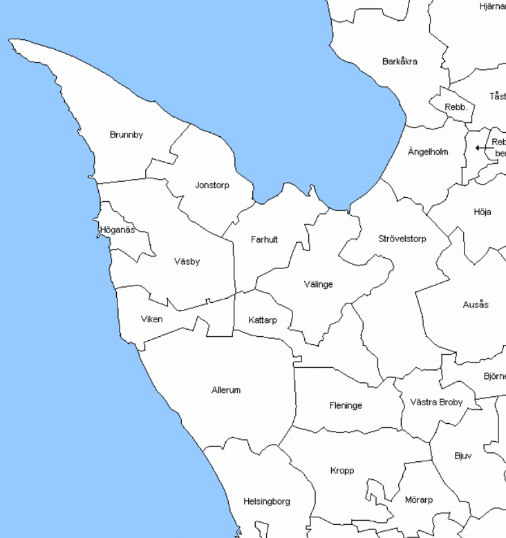 Kartbilden är från västra Skåne där socknarna Väsby och Viken hittas i närheten av Höganäs. Idag använder vi oss av beteckningarna församlingar och kommuner. Men förr var en socken det område som gemensamt hade en kyrka, några byar eller gårdar tillsammans.