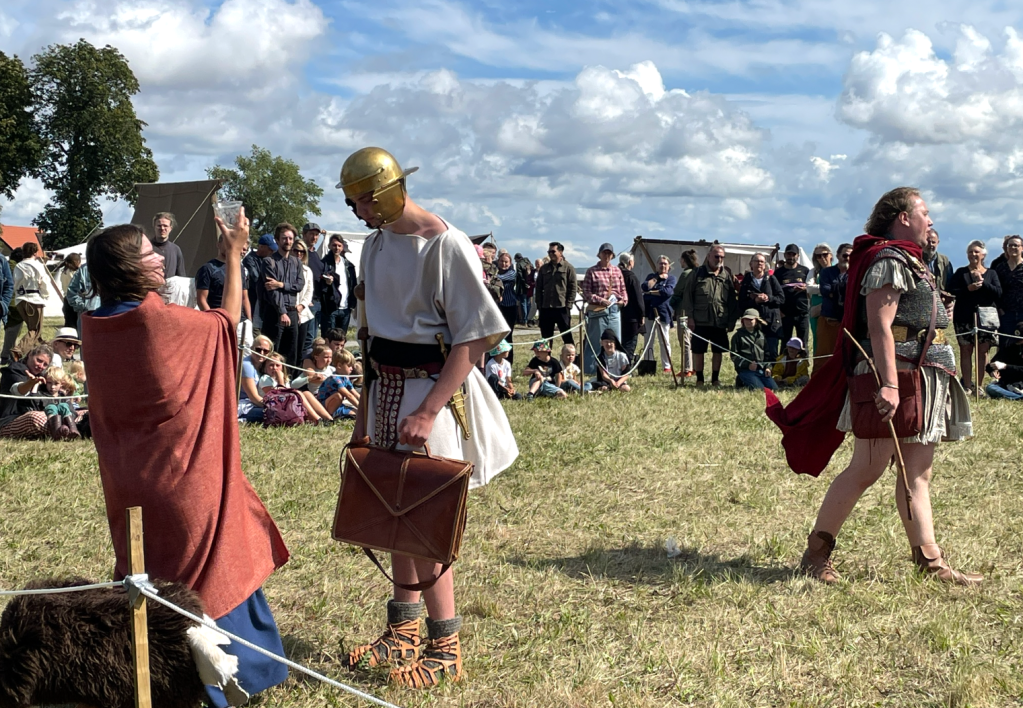 Något av det första vi fick bevittna var när ”barbaren” till höger på bilden ovan tog värvning i den romerska hären. När han svurit trohet till romarna fick han en gåva i form av ett glas som hans hustru fick innan maken begav sig iväg. Bilden nedan är hämtad från tidningen Sydsvenskans besök under Uppåkradagarna.