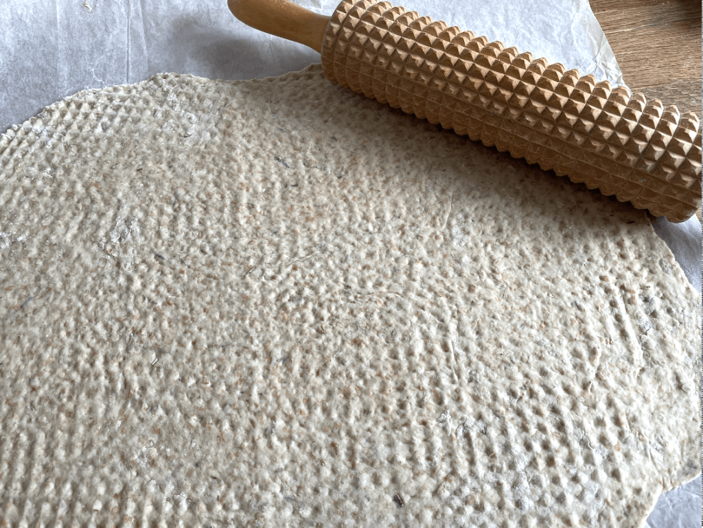 - Kavla ut den jästa degen till en rektangel i plåtens storlek. Kavla gärna på slutet med en kruskavel alternativt nagga med en gaffel.