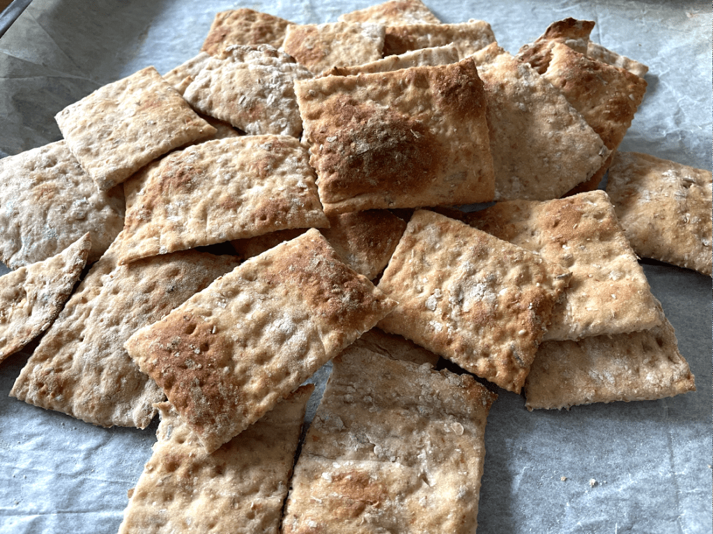 Bakas på en plåt som sedan ger 20 – 30 mindre bitar. Ugnen 250 grader