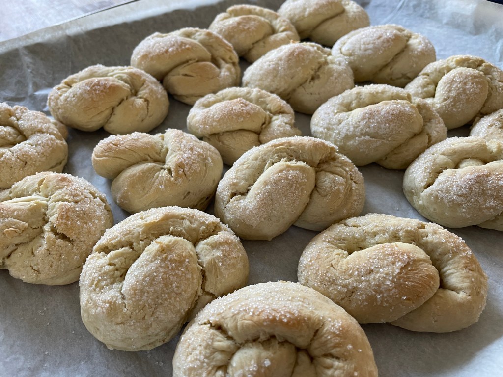 - Dela degen i 36 bitar och rulla ut dem till smala längder som är ca. 15 cm långa. Forma till kringlor och doppa ena sidan i strösocker som hällts på ett fat.