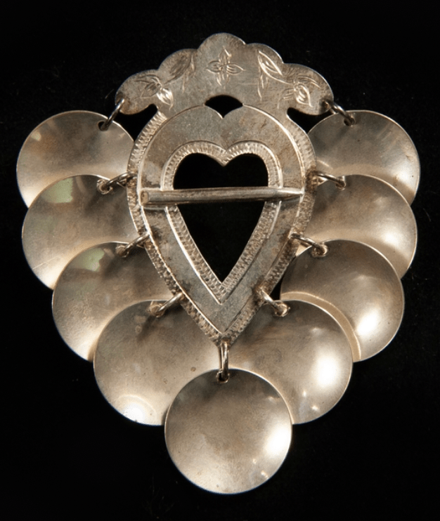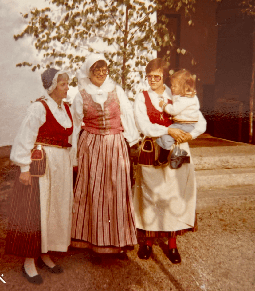 Mamma Mona står i mitten och då hon var född i Ronneby har hon en Blekingedräkt på sig. Lilian och jag, med ursprung från Nässjö, har dräkter från Tveta härad. Min dotter Linda född 1976 var för liten för en folkdräkt men hade hemsytt och stickat på sig. På bilden är Linda mest intresserad av den sölja som jag har i skjortans hals. En sölja är ett spänne, en hylsa eller en ring som vanligen används för att hålla samman något.