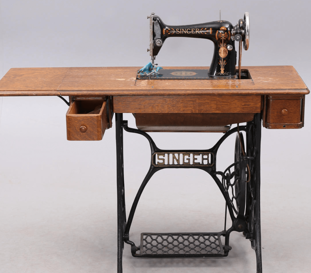 Min mormor Gulli var en duktig sömmerska enligt vad mamma berättat och på min morfars sida fanns det både någon hattmodist och sömmerska. När jag var liten tyckte jag mycket om att vara intill mamma när hon sydde kläder till oss barn eller ändrade till andra personer eller från de damklädersbutiker där hon arbetade. Den första symaskinen hon själv ägde fick hon 1954 av sin svärmor, min farmor Astrid, som inte själv kunde sy men var glad att mamma kunde. Farmors äldsta dotter, min pappas syster Lilian var också en fantastiskt duktig sömmerska och arbetade även hon i den textila sektorn. Det kan ha varit det som förde samman de båda svägerskorna till att bli mycket goda vänner. Mammas Singermaskin såg ut som på bilden och underredet till den har jag kvar som ett bord i växthuset där jag nu sitter.