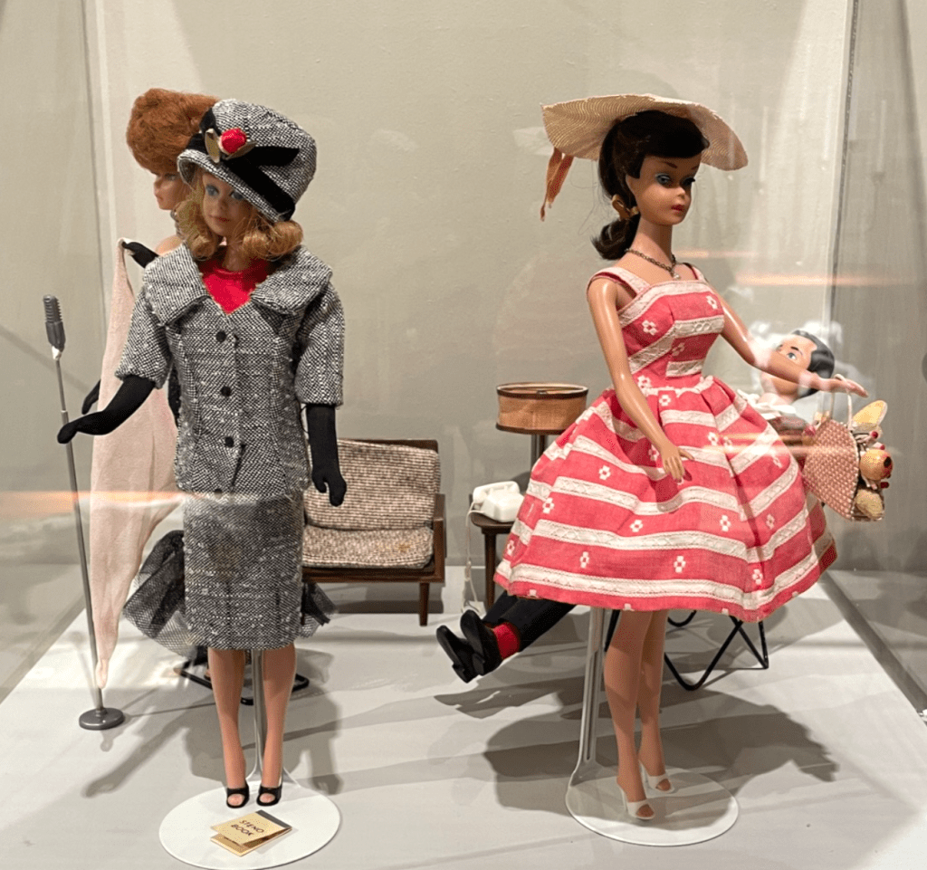 1964 föddes min lillasyster Catharina och då fick vi hennes äldre syskon välja ut varsin leksak i en affär. Mitt val blev en Barbiedocka. Den finns kvar och mina barnbarn leker med eller gör kläder till henne när de är här. När jag förra sommaren besökte en ”nostalgisk” utställning på Katrinetorp i Malmö fanns det fina dockor på plats. Då flashade minnet förbi från tiden när faster Lilian och min kusin Gunnel kom på besök och våra mammor satt i flera dagar och sydde Barbiekläder till oss. Dräkten till vänster är inte helt olik en som syddes vid det tillfället. Tyvärr skadades den vid en vindsförvaring många år senare då en musfamilj fattade tycke för kläderna.
