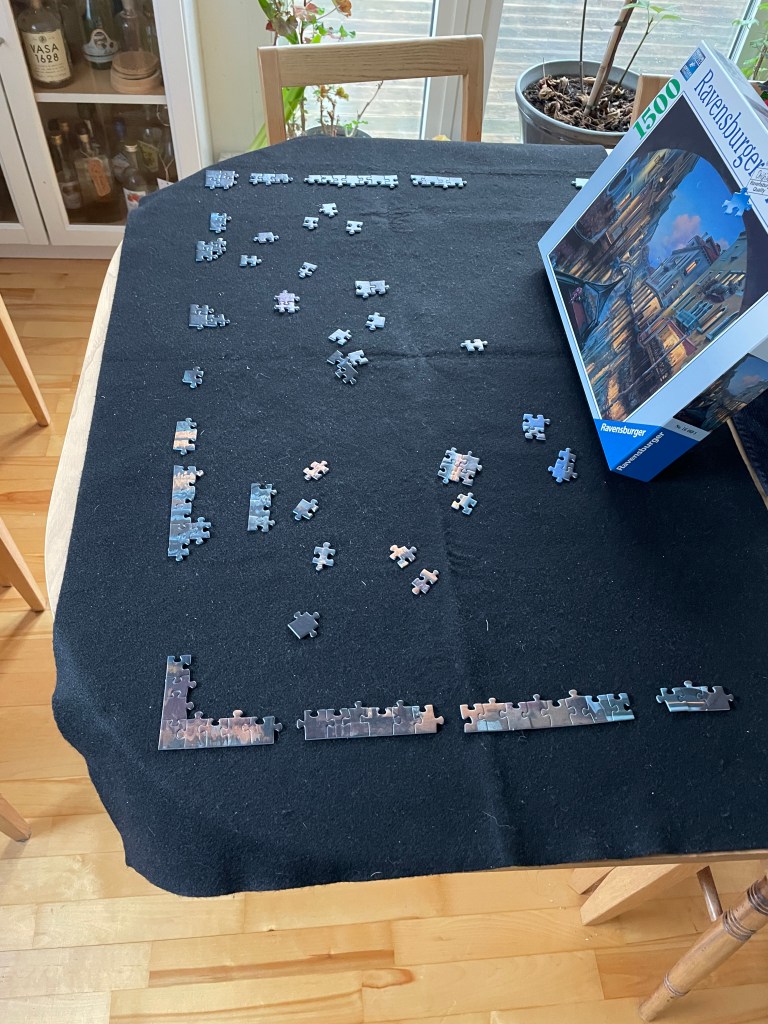 Vid varje års slut och nytt års början har jag som en tradition att lägga något pussel. Det får inte vara för lätt och ska gärna ta några dagar att pussla ihop. Årets pussel lämnade min yngsta son här redan i våras och igår kom jag igång med det. Han sa att det är ett kul pussel som han sysselsatt sig med i några veckor. De jag lagt tidigare med 1000-1500 bitar brukar jag fixa på högst en vecka men årets må vara ”kul” men fy sjutton så svårt. Nu gäller det att visa tålamod, lugn och god vilja – kanske i flera veckor. Det återstår att se om jag lyckas. Bilden visar hur långt jag kom första dagen. Om lyckan står mig bi kommer jag att kunna visa upp ett fullgott resultat innan sommaren.