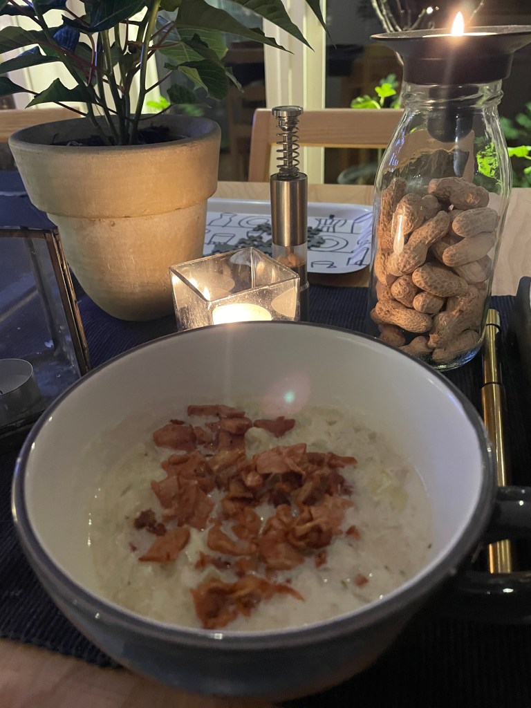 För några dagar sedan kom en leverans av frukt och grönt som vi prenumererar på. Där fanns ett blomkålshuvud med och halva användes till dagens torsdagssoppa. Förutom kålen hamnade skuren purjolök, stjälkselleri, kokt potatis, kryddor, buljong och matlagningsgrädde i grytan. God blev den och serverad med ett danskt rågbröd med skivad tomat på var både ögonen och magen nöjda. Då vi är vegetarianer är det inte kött på soppan utan stekt vegobacon. Det har en rökt smak som passar till den milda soppan.