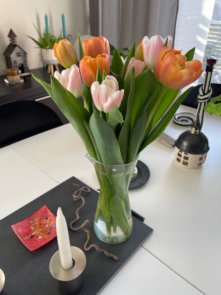 De vackra tulpanerna som glatt oss har nu vissnat och kommer snart att avlösas av det vårlökarna utomhus lyfter fram. Våra hönor har börjat sin äggproduktion efter vintervilan och våra äpplen från egna träden är sedan länge uppätna.