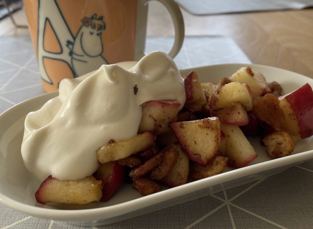 Jag vill inte anamma metoden med ett äpple i armhålan men serverar gärna stekta kanelpudrade äppelbitar med glass, grädde eller vaniljyoghurt som ett mellanmål eller en dessert. Snabbt, gott och nyttigt!