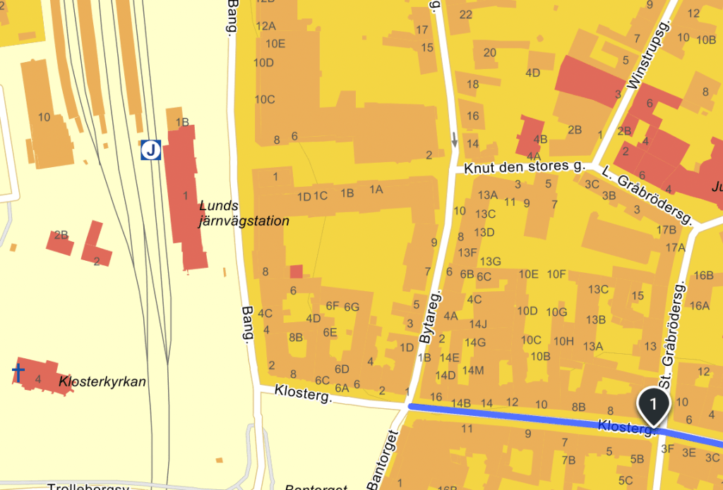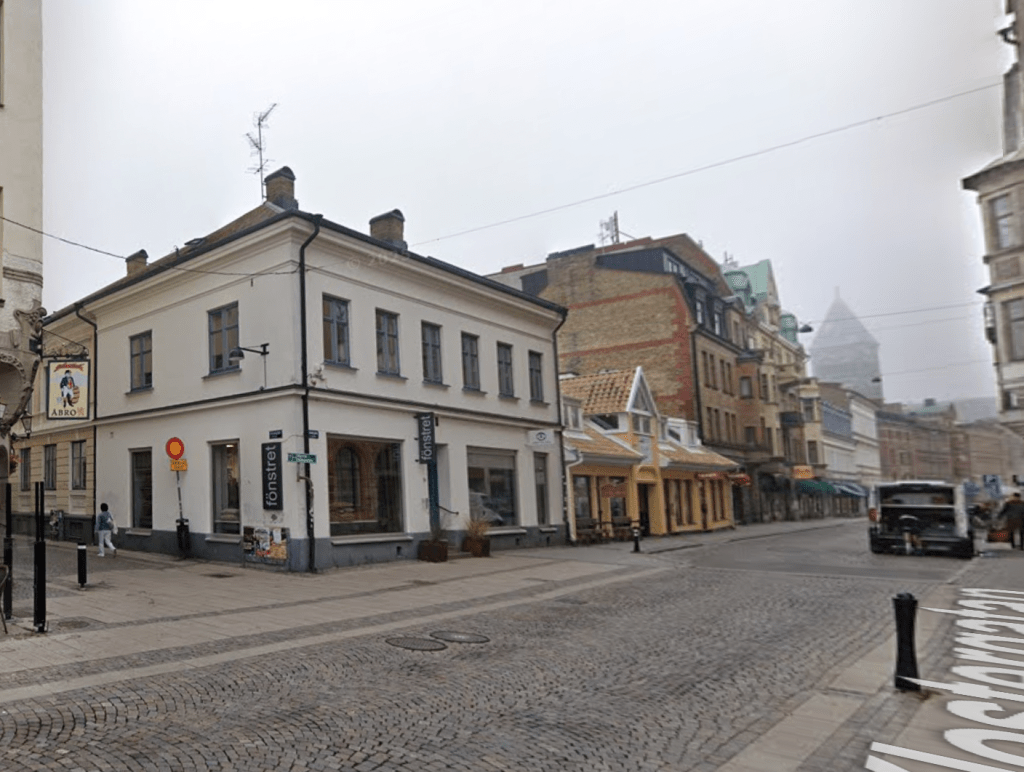 Den lilla gula byggnaden på bilden har en ingång till en gränd som löper från Klostergatan, genom gården och ut på tvärgatan som heter Bytaregatan. Den syns till vänster på bilden. Beträffande det gula huset så byggdes den vänstra sidan 1853 medan den högra där vi hade vår verksamhet byggdes redan 1826. Öppningen i huset och gränden på gården ska vara byggd i slutet på 1980-talet.
