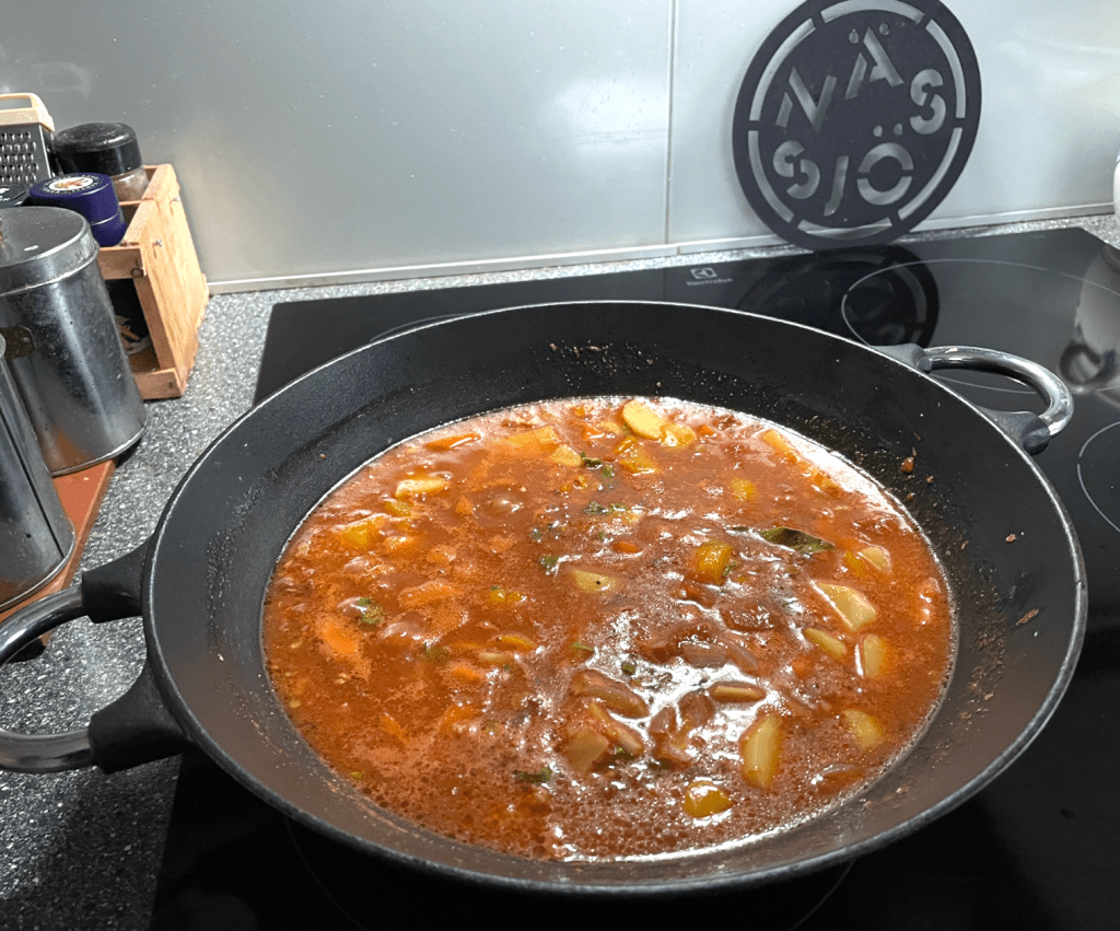 4. Nu hälls krossade tomater, vatten och buljongtärning i grytan och får småkoka under lock tills potatisen är mjuk. Rör då och då.. Smaka av med salt och peppar. Önskas en lösare konsistens på gulaschen kan extra vatten tillsättas.
