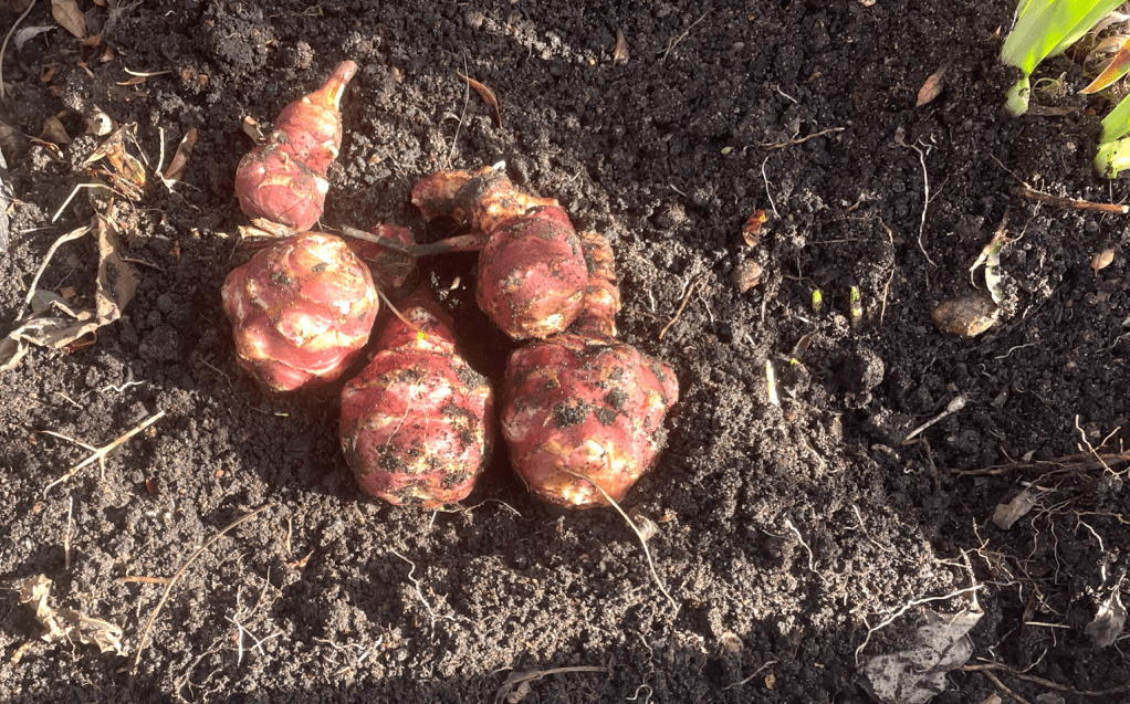 Nu några dagar senare är jag inte lika känslig för ljus längre och har varit ute i trädgården för att så smått börja vårarbetet där. Det började verkligen att klia i fingrarna av längtan! Lite buskar blev ansade och ur en odlingslåda plockade jag fram de här lyxknölarna. För några år sedan fick jag några jordärtskockor i grönsakslådan från Årstiderna i Danmark. Jag satte då 2-3 i jorden och nu kommer det nya skockor varje år. Bladverket är som finast sent på hösten och vissnar sedan ner innan knölarna plockas upp, men de kan även övervintra.