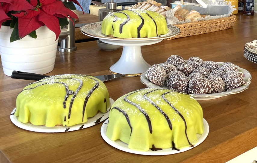 I helgen var det regnigt och dimman låg ganska tät över sundet mellan Malmö och Köpenhamn. Under några dagar var det ett besök av ett enormt hangarfartyg från Frankrike som väckte stor uppmärksamhet. Det ska ha varit bemannat med 1800 personer och lika många baguetter bakas det dagligen i skeppets eget bageri. På födelsedagens brunch fanns en uppskuren baguette som ses skymta fram bakom tårtfaten.