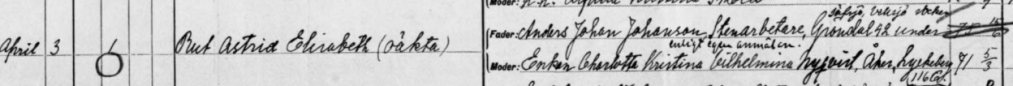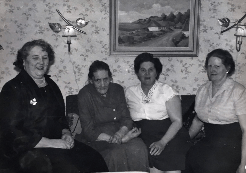 Bilden visar Wilhelmina Wahrling (1871-1963) med döttrarna Greta (1903-1977) Ebba (1912-1989) och Astrid (1909-1974). Den togs på tidigt 1960tal i Astrids lägenhet i Nässjö. Wilhelmina Wahrling hade som gift fått namnet Nyqvist men blev tidigt änka och gifte aldrig om sig utan var en ”modern kvinna” som senare blev sambo med Anders Johan Jonsson (1875-1954). Därmed blev systrarna ansedda som oäktingar även om det fanns en far i hushållet. Nedan syns ett klipp från födelseboken i Nässjö 1909.
