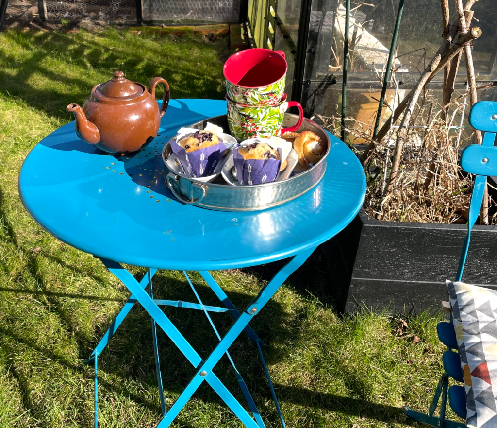 Nu har årets trädgårdsaktiviteter börjat och det är en skön känsla att på kvällen ha tröttat ut kroppen med bra aktiviteter, skitiga byxknän och soltecken i ansiktet (eller så är det bara smuts). Mysigt är det också att kunna ta en paus för te med tilltugg och sitta utomhus. Som jag har längtat! Det märks att hönorna uppskattar våren och att vara i sin utegård där de har full koll på vad vi gör. Våra hönsdamer producerar en hel del gödsel som är bra att blanda i jorden där det ska sättas fröer och planteras sticklingar om några veckor. I söndags producerades det första ägget som sedan har följts av flera. Våren är verkligen igång!
