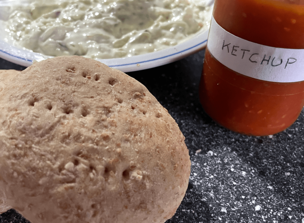 Efter några timmar i trädgården idag gick jag in för att förbereda och tillaga middagen. Det blev som vanligt vegetariskt och den här gången en burgare av baljväxtfärs i hembakade grahamsbröd. Olika sorters rotsaker strimlades grovt och efter en stunds kokning stektes de sedan för att få en stekyta. En variant på pommes blev resultatet. Jag hade kunnat använda ugnen men då stekpannan ändå var framme blev det den som nyttjades. En tzatziki som innehöll både gurka och äpple var gott till och i ett litet glas serverade jag hemkokt ketchup. Den gjordes för någon vecka sedan av tomater som fanns i frysen. Det blev en god måltid och den var väldigt mättande (tyckte iaf jag).